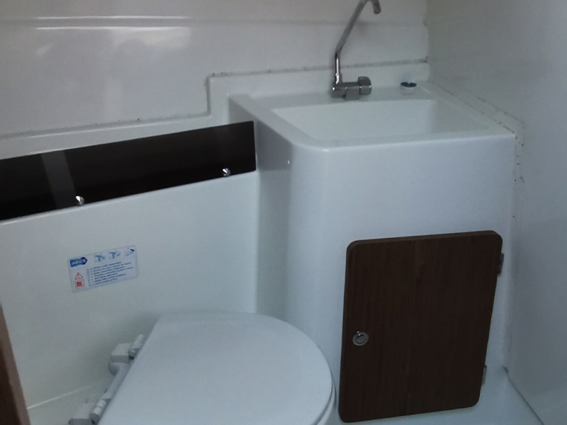 Amenities: Separate head (toilet), cockpit shower for rinsing off after a swim, and 220V/12V sockets throughout.